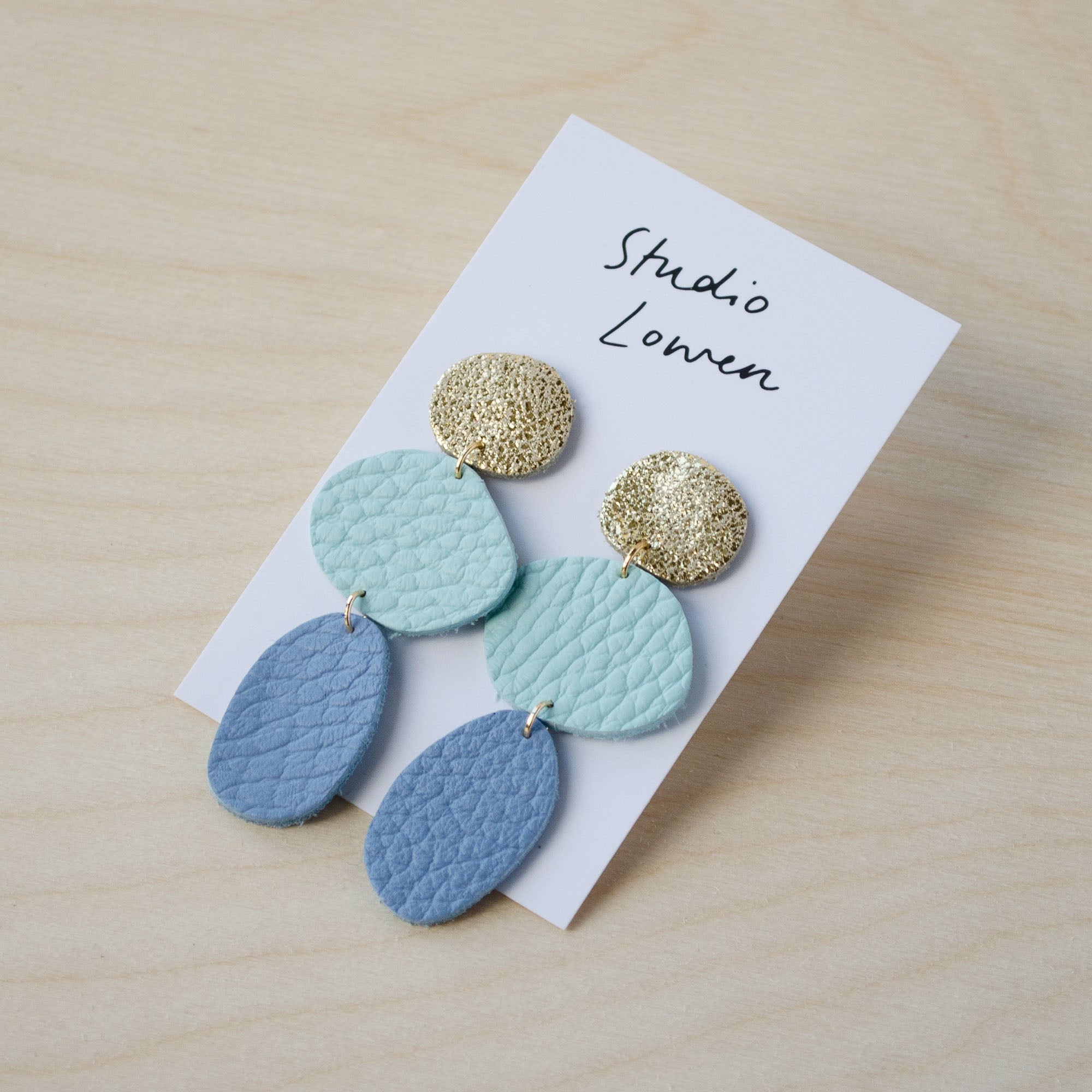 Made with our leather and suede offcuts. Each pair of earrings are cut with scraps of our leathers and suedes, they are then carefully assembled and attached to our jewellery findings.