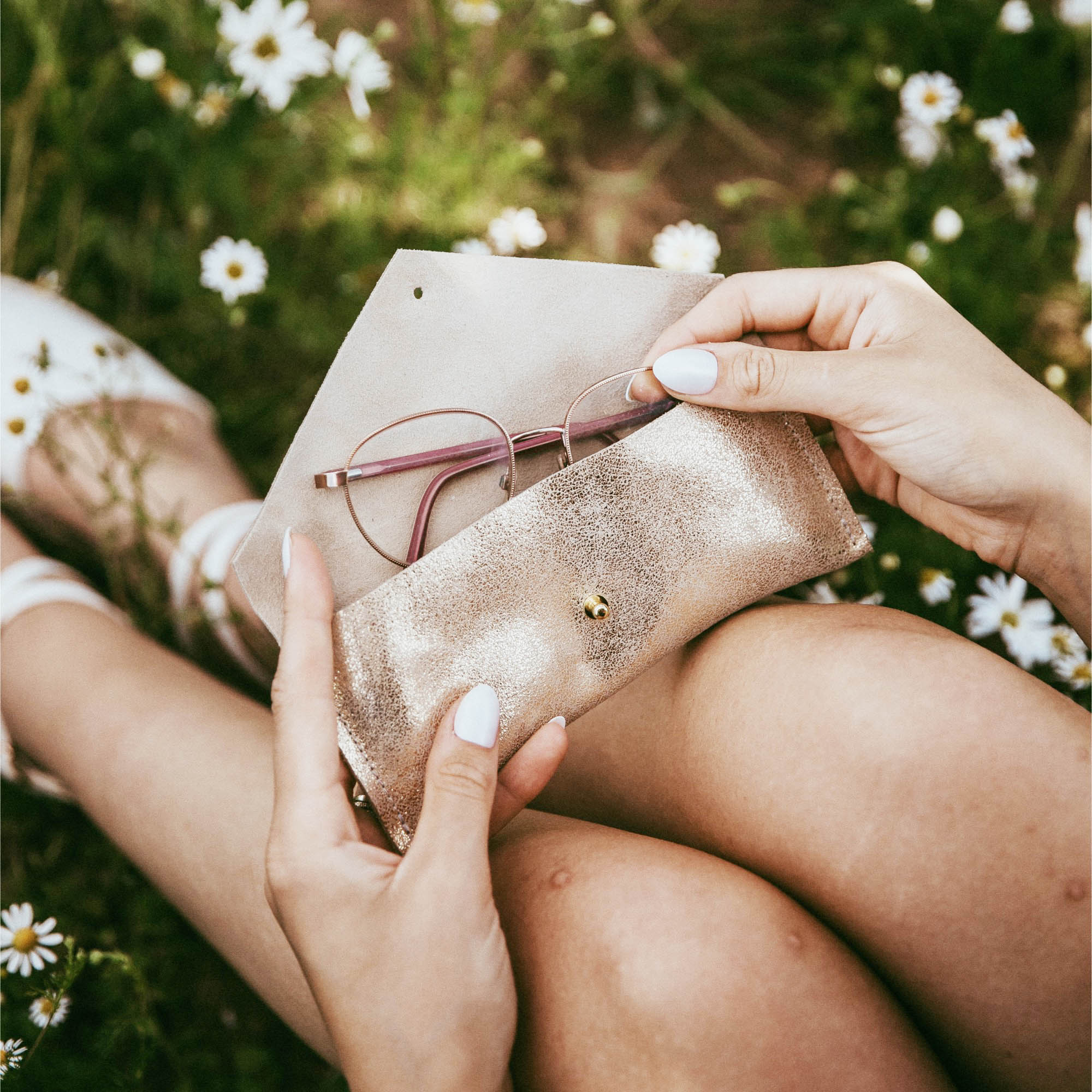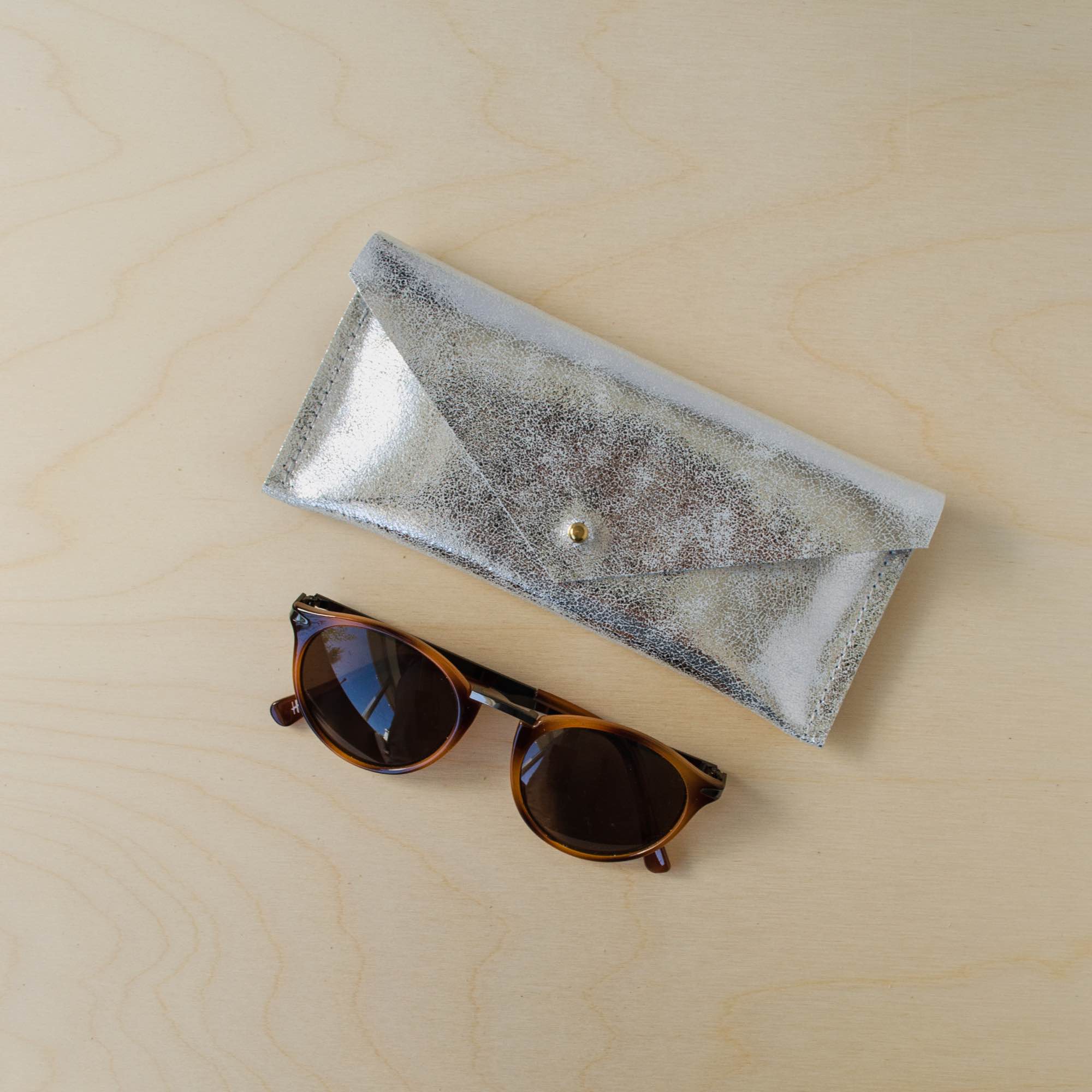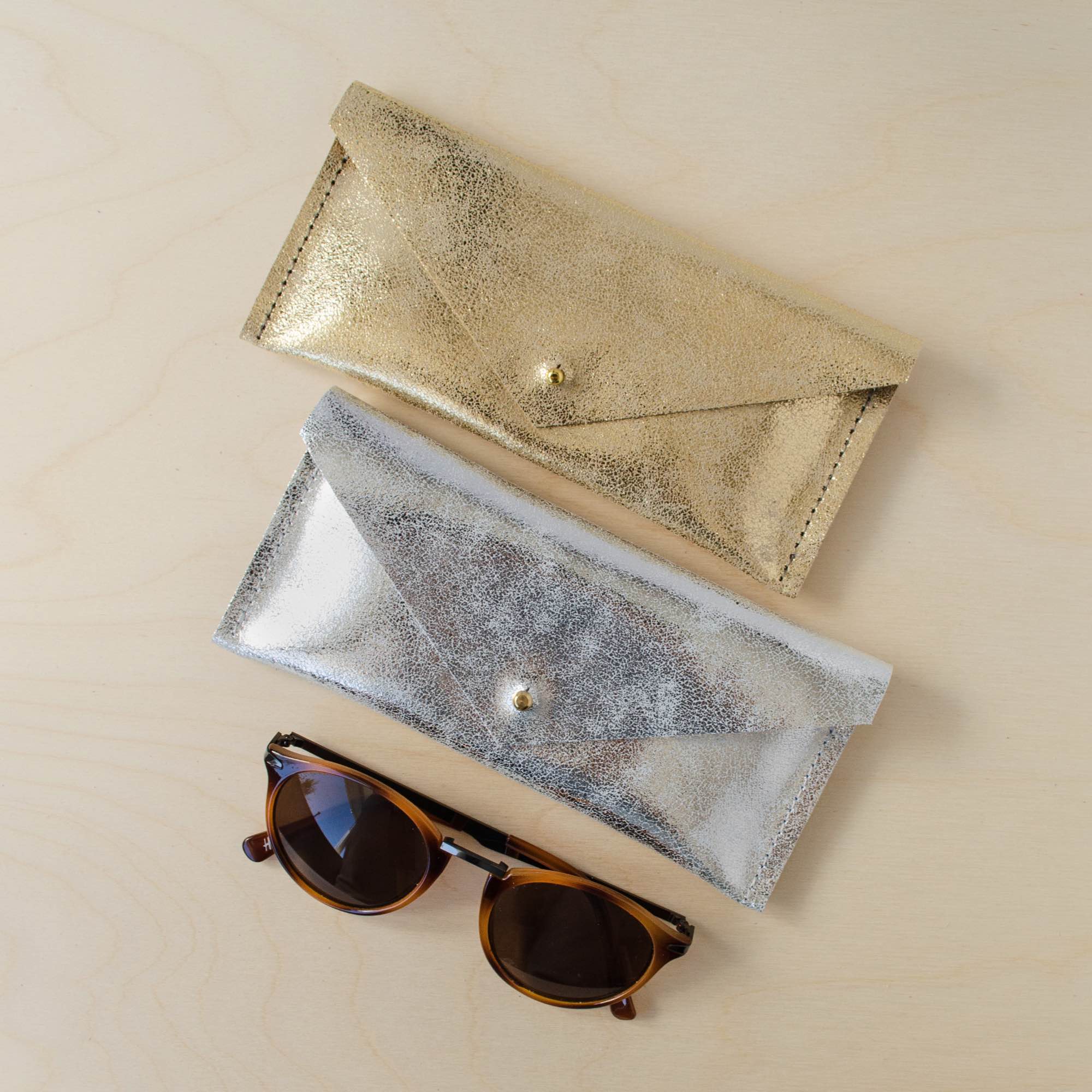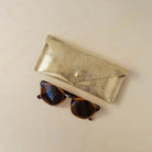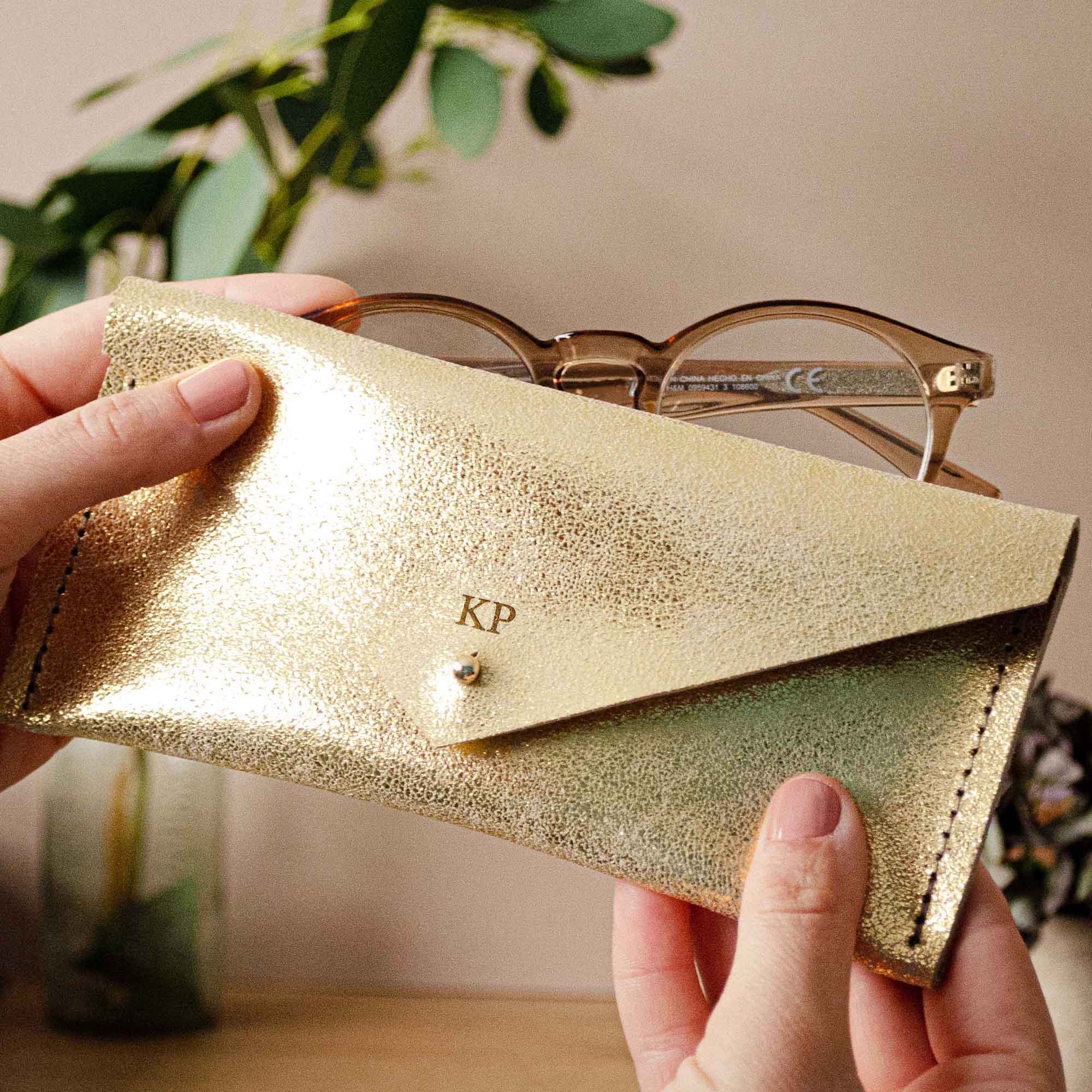 This Leather Glasses case features a minimalist envelope design and is available in Gold, Silver or Bronze. It's a soft glasses case that will easily slip in to your pocket or a small bag, the glittery metallic leather makes it easy to find in your handbag!