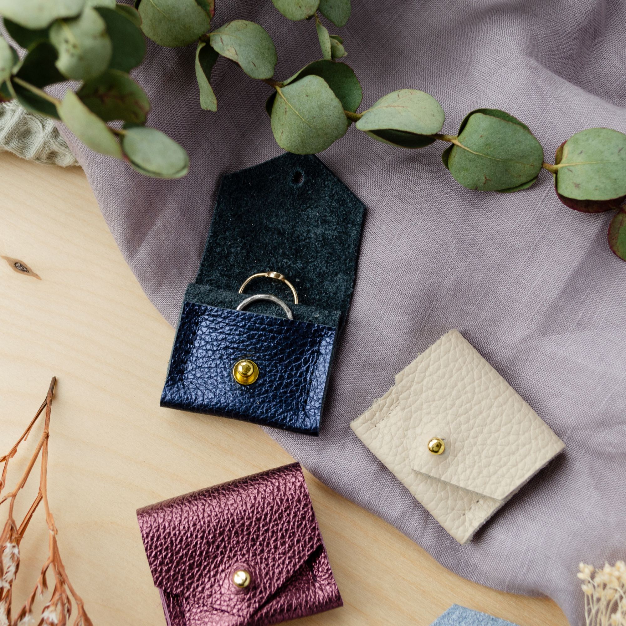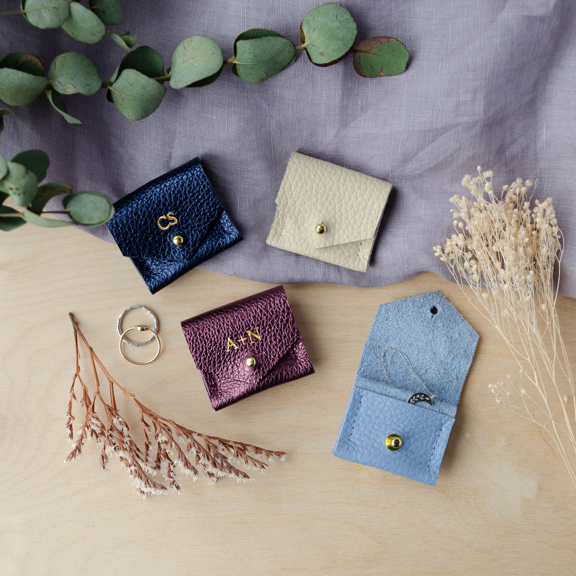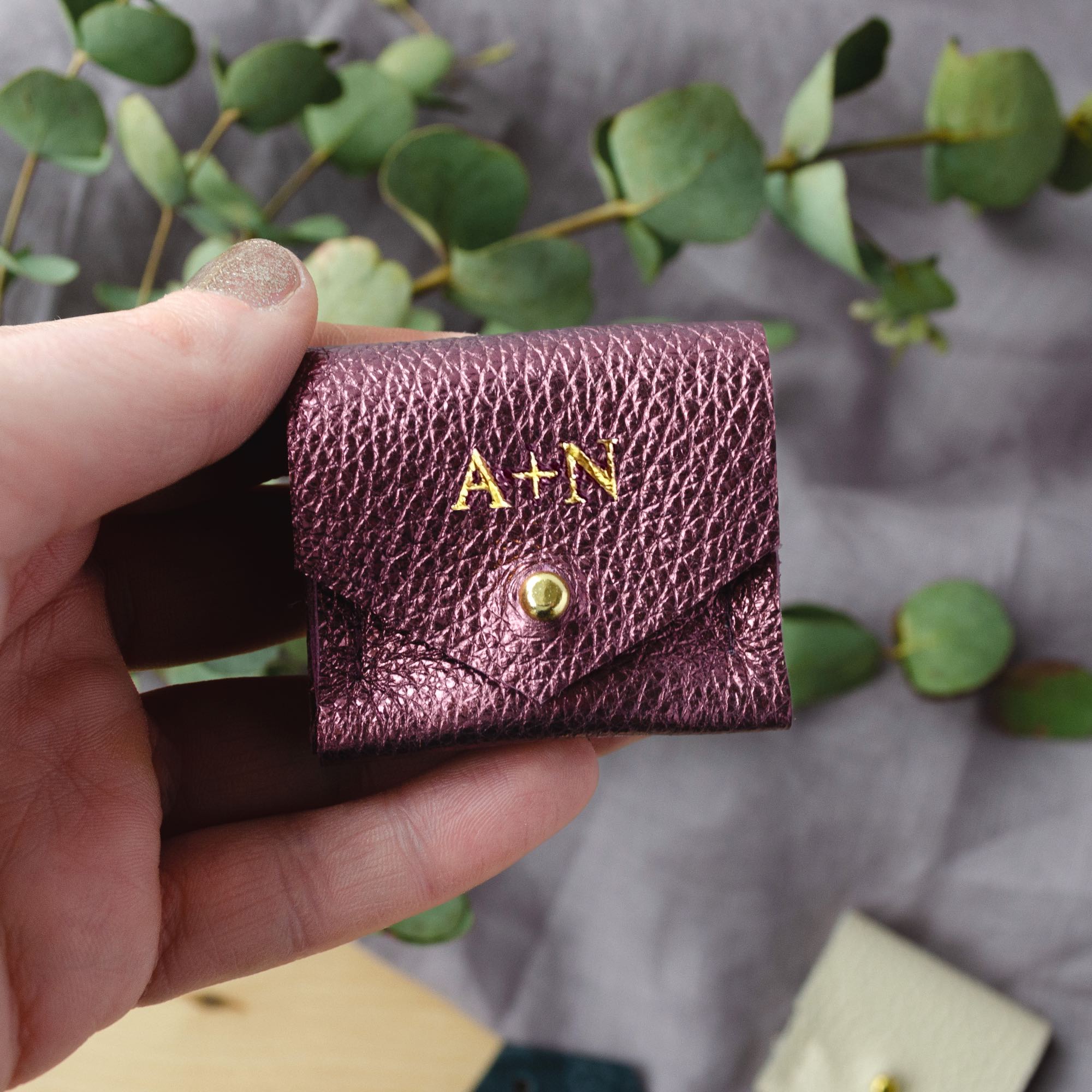 Our Wedding Ring Pouch has been designed to carry two rings with two pockets, one for each ring. Perfect for keeping your wedding bands together on your wedding day! They come in a range of soft leathers, you can stay classic and go for a black or cream. Or, go bold and have a metallic rose or metallic copper. There's a colour to suit everyone. You could also match it to your groomsmen coloured ties, olive green?