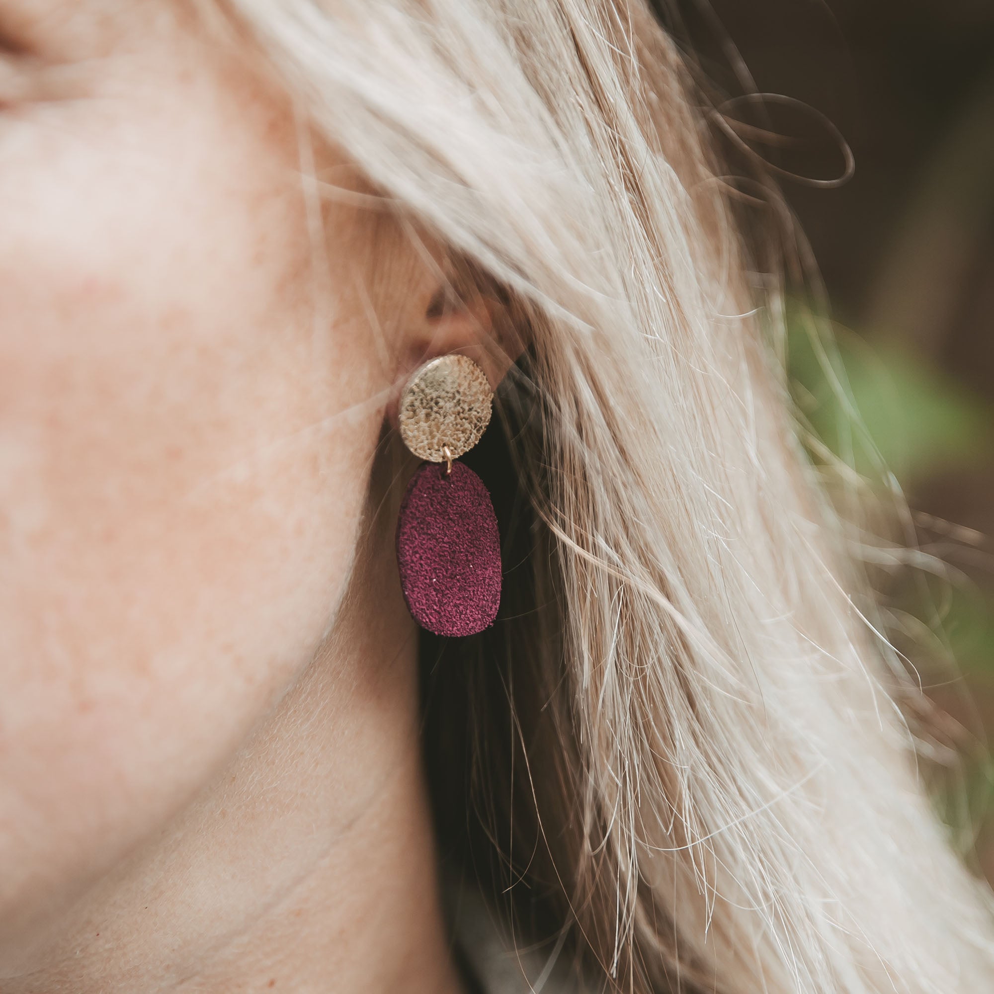 The Maia Earrings in Suede come with a the shimmer gold stud leather piece at the top, then you can choose one of these colours for the dangle drop colour. Choose from: