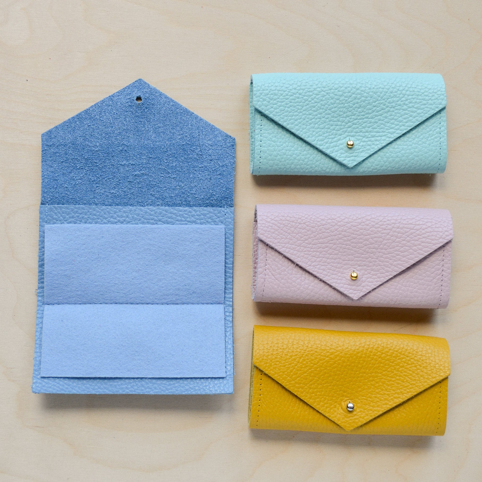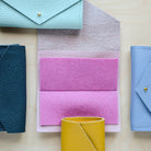 Every item in our Crafters Collection is handmade in our studio in West Cornwall using a high quality, Italian leather. We cut out the pieces of leather and the felt for each pouch before sewing all the pieces together by machine. It’s finished with a metallic stud to fasten it shut.