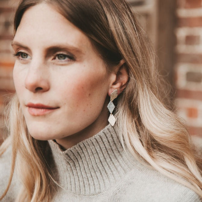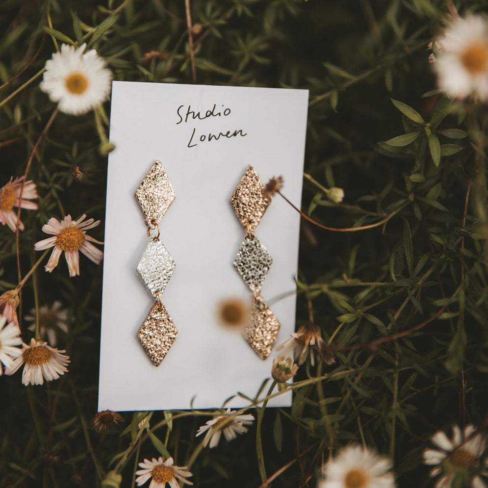Our Senara Triple Diamond stud earrings are beautiful, statement and minimalist whilst also being very lightweight and easy to wear.
