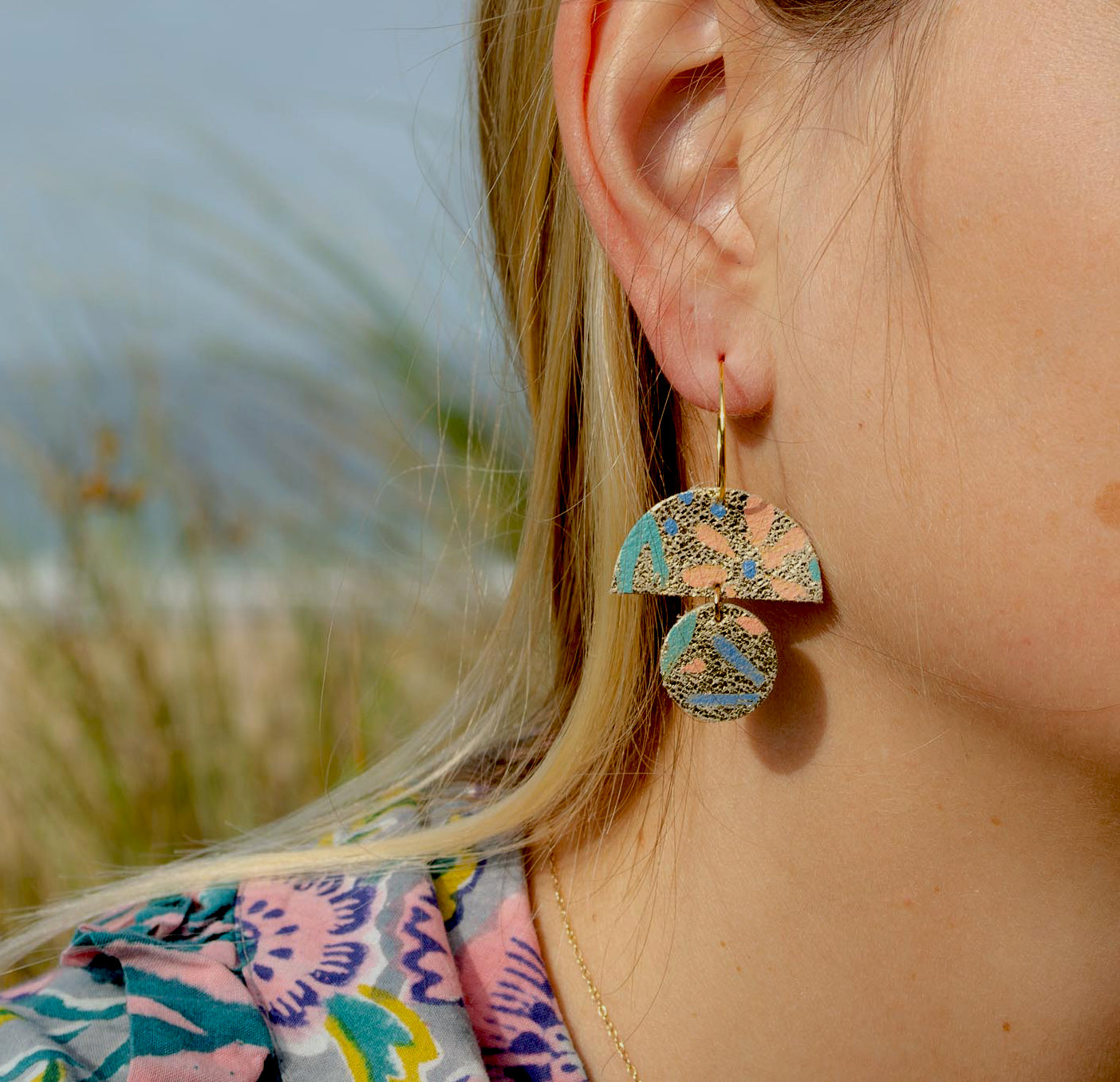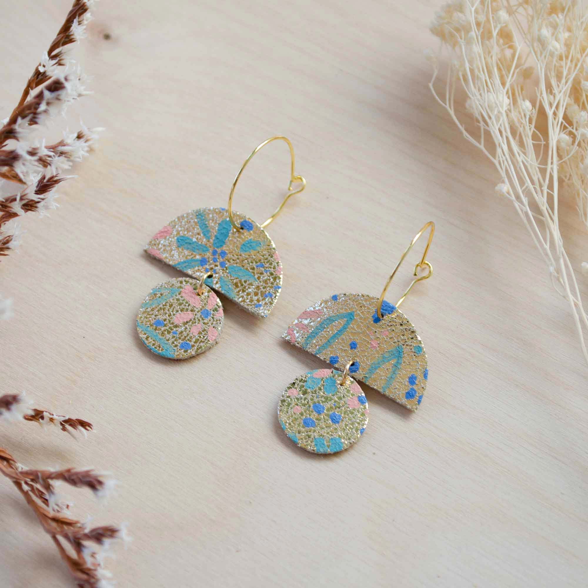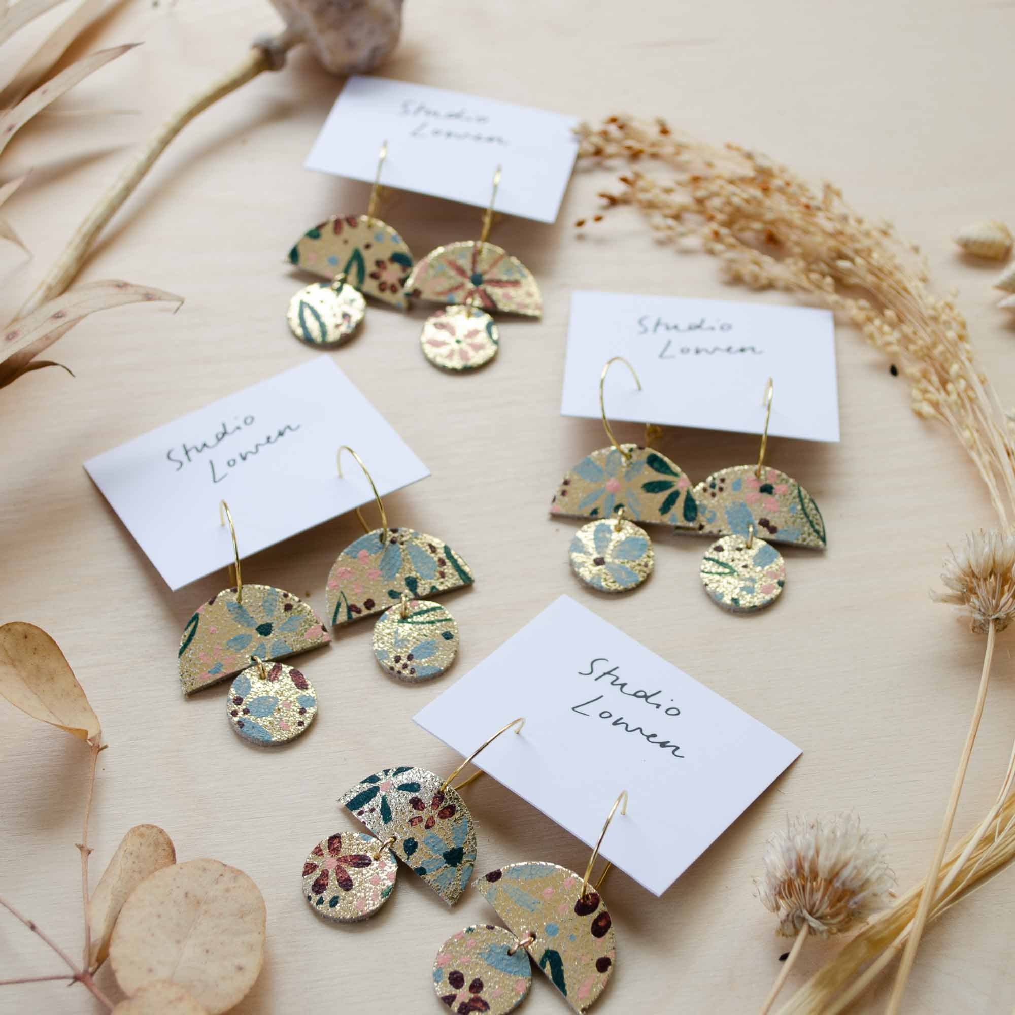 Made from offcuts of shimmer gold leather painted in beautiful pastel and autumnal hues to brighten the gloomiest of days.