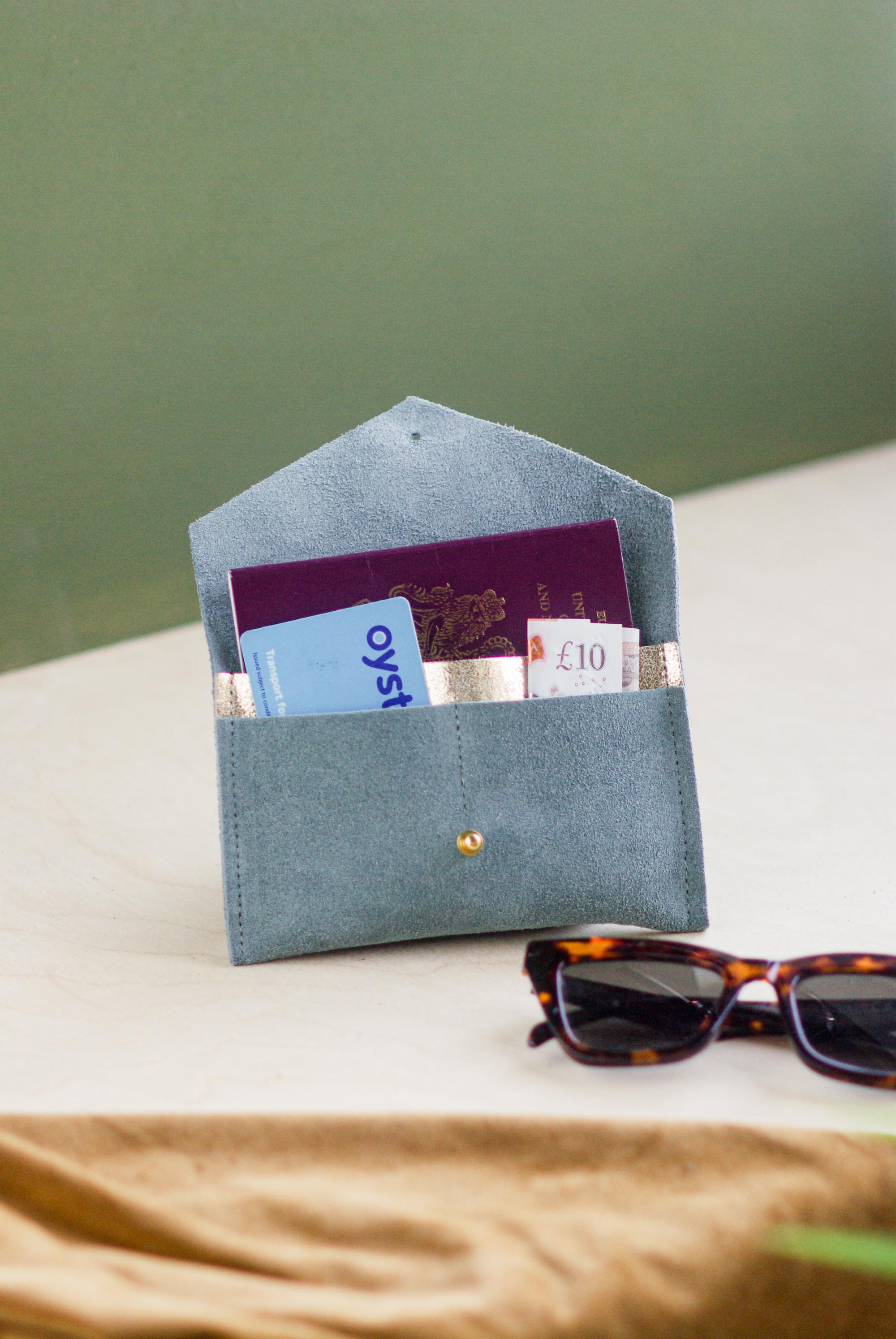 The Leather Envelope Passport Pouch case is available in a choice of colours. Features a gold contrast pocket.