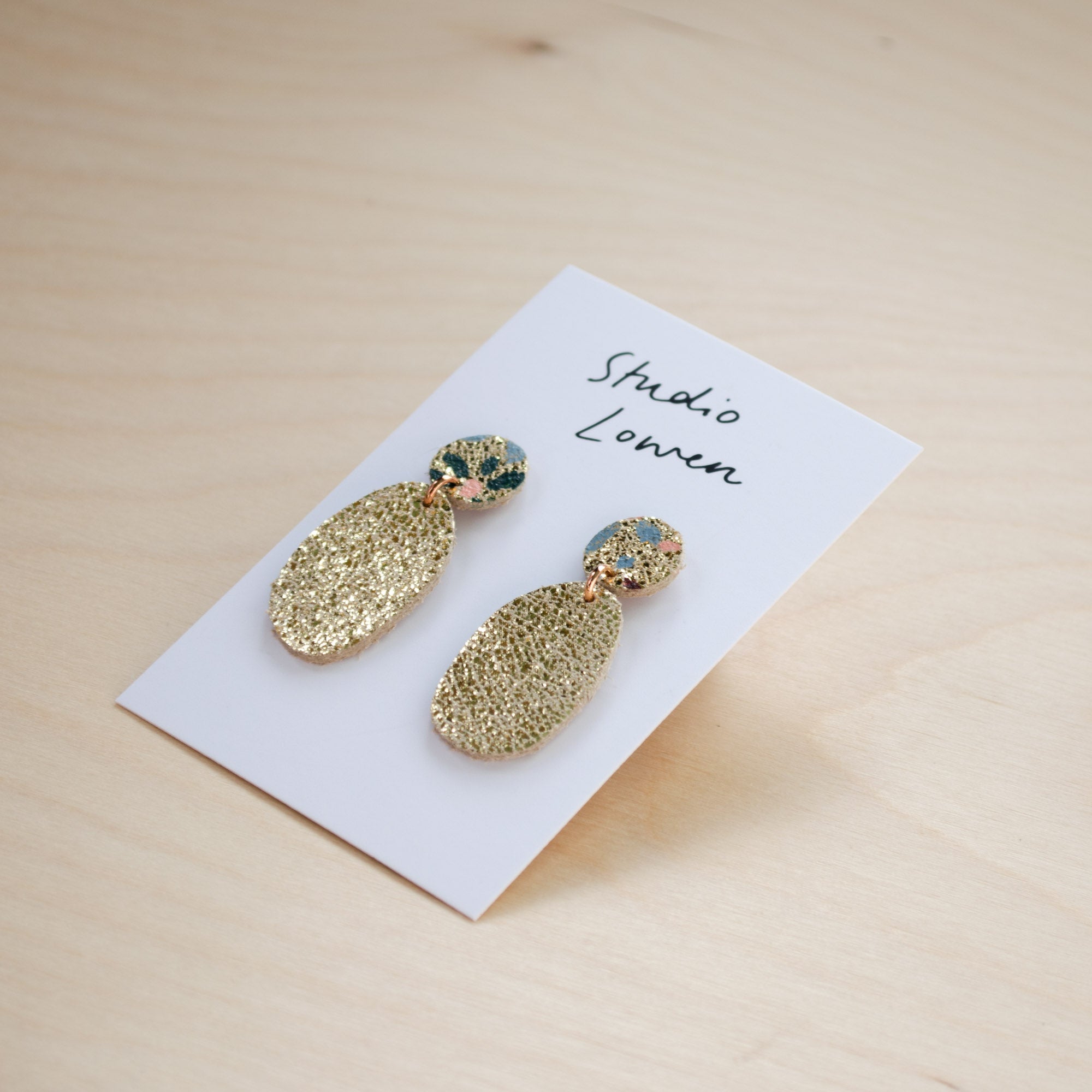 Made from offcuts of beautiful gorgeous shimmer gold leather from Italy which is hand painted in a beautiful design.