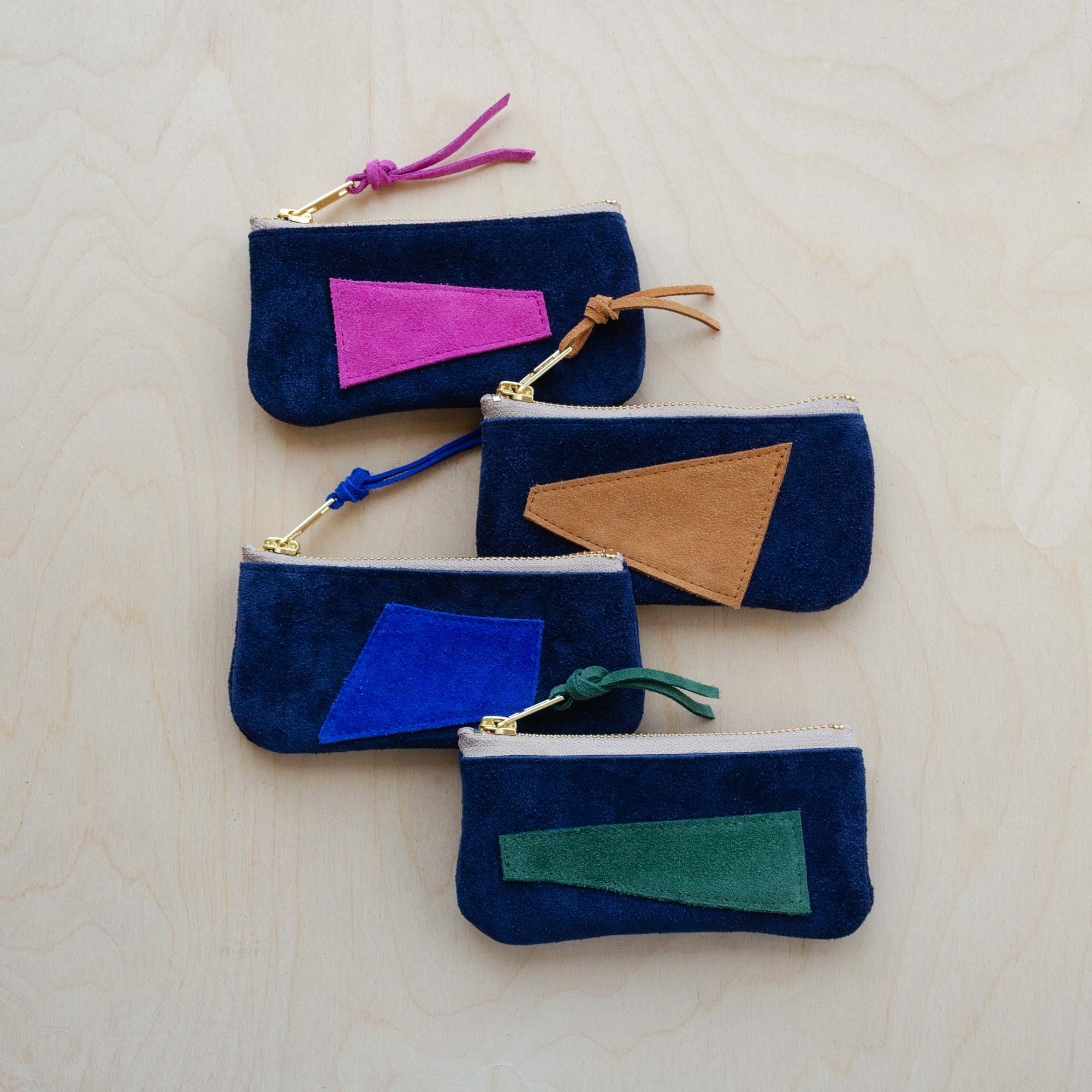 These compact zippy purses celebrate the abstract forms of our offcuts. Featuring a brass YKK zipper they are the perfect size for bank cards and cash.