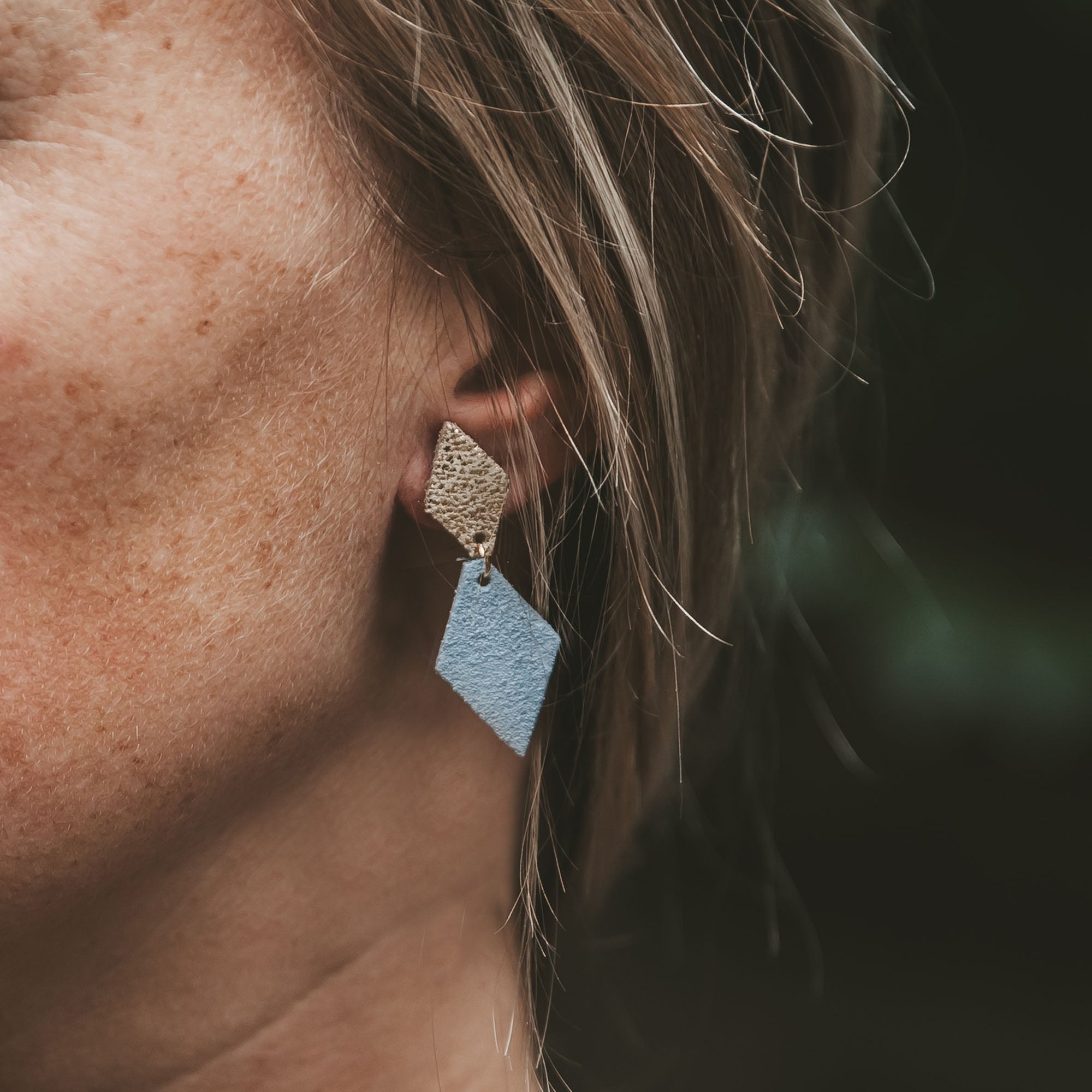 Our Alba Earrings are the perfect pair for adding a little shimmer to your outfit, these are lightweight and super comfy. This classic stud design, features the top diamond in Shimmer Gold leather, and then you can customise the second diamond from our suede colour range. They are a flattering everyday pair of earrings in a wide range of colours that'll complete any outfit!