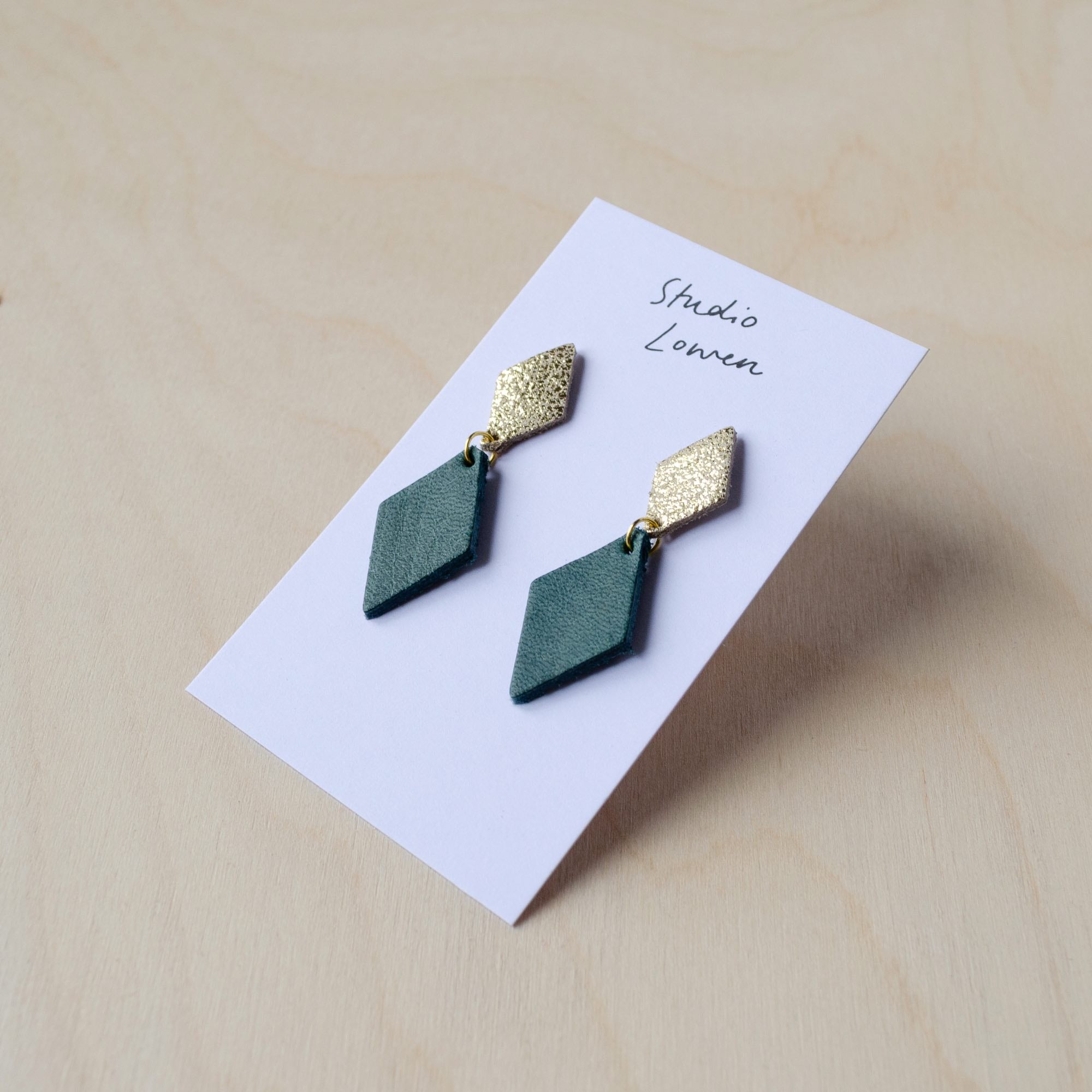 Made from offcuts of our beautiful suedes and leathers, these have a "Shimmer Gold" leather stud and a choice of colours for the dangle drops, all options have a gold coloured top diamond, pick below for the colour of the dangle diamond.