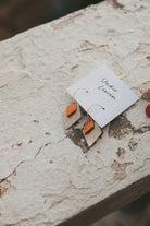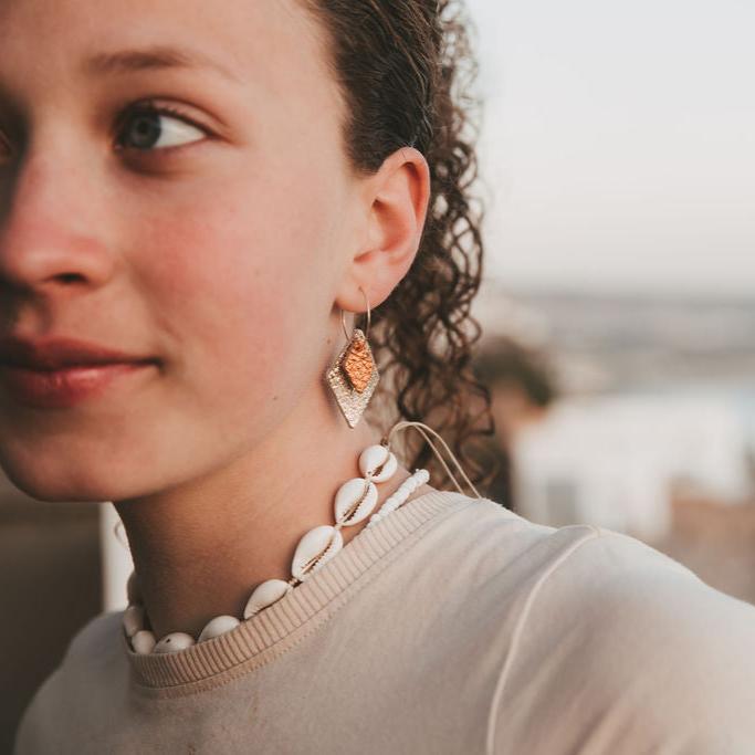 Made from offcuts of our beautiful suedes and leathers, these have "Shimmer Gold" larger diamond shape and a smaller colourful diamond pop that sits in front. Choose from lots of colours like Metallic Copper Orange which is perfect for Autumn, Olive or Pine Green for an everyday earthy tone or pick a neutral like Cream or Black to get with everything. The shapes dangle prettily from 18K gold plated hoops.