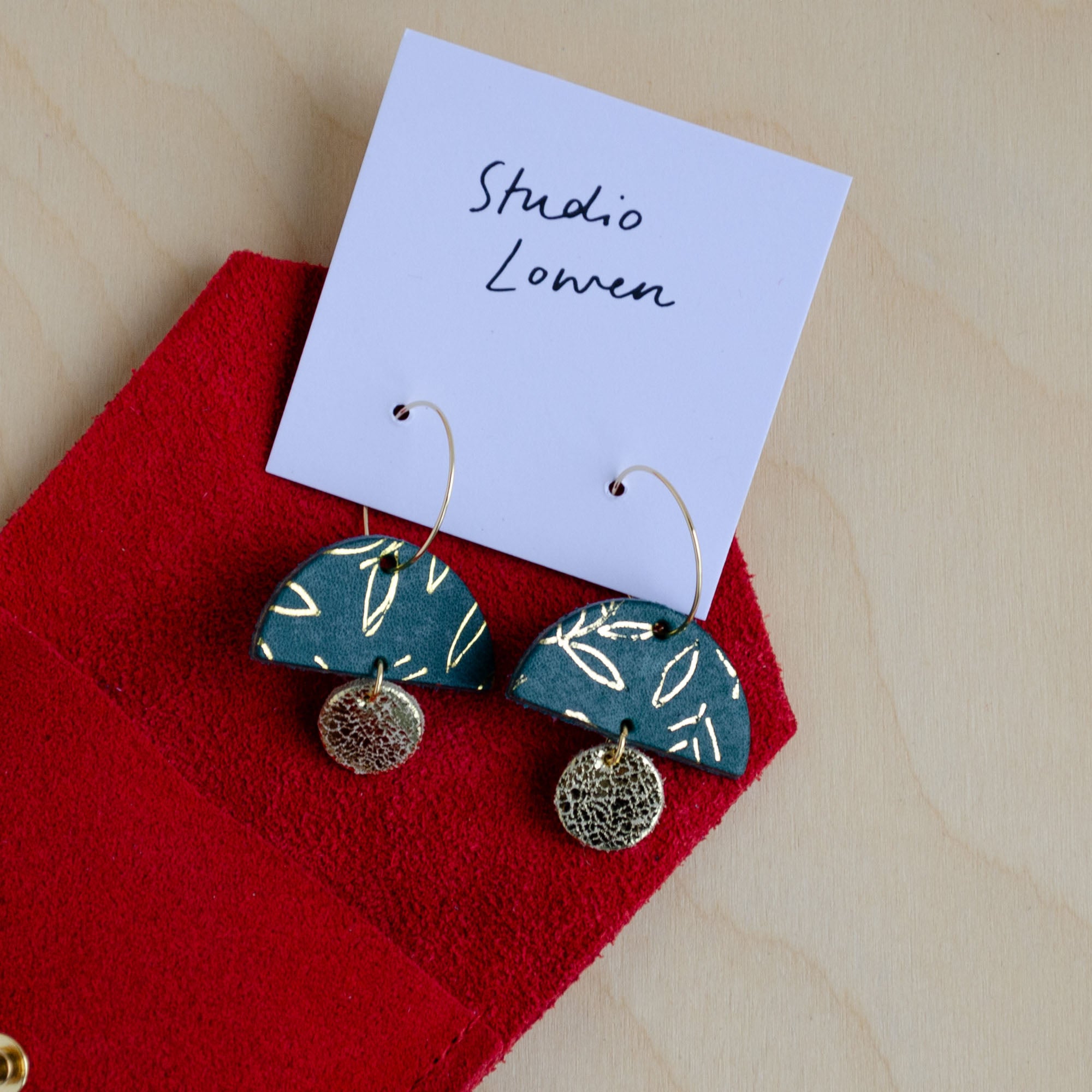 These hoop earrings are based on our best selling sunrise hoop design, they feature a forest green leather crescent moon shape in Forest Green leather which has a gold foil botanical design drawn onto the leather, finished off with a gold dot at the bottom