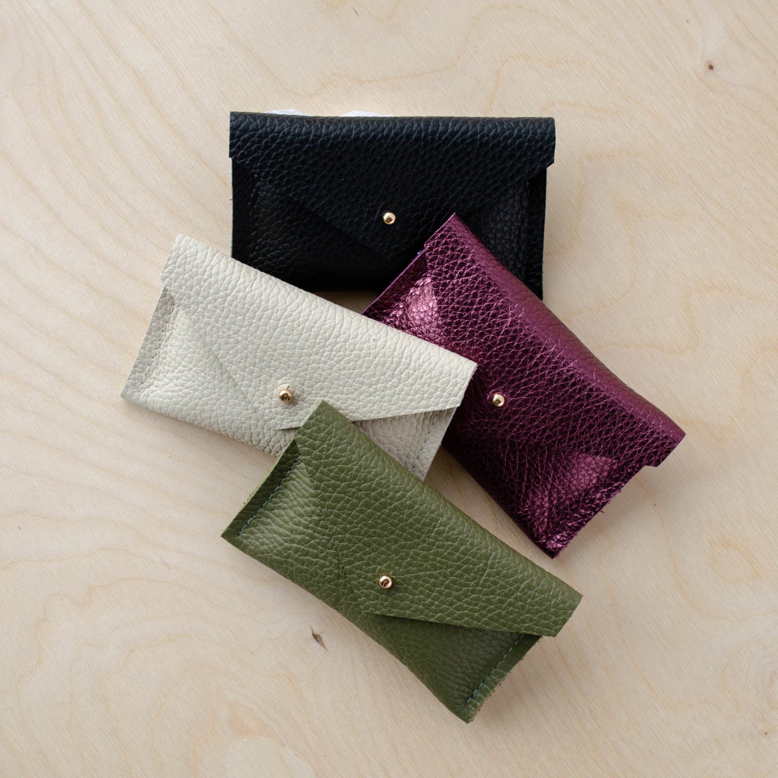 Each leather card holder is carefully crafted using high quality Italian Leather. Each one is finished with a pair of minimalist studs to fasten and keep your cards safe. Choose from a silver or gold stud.