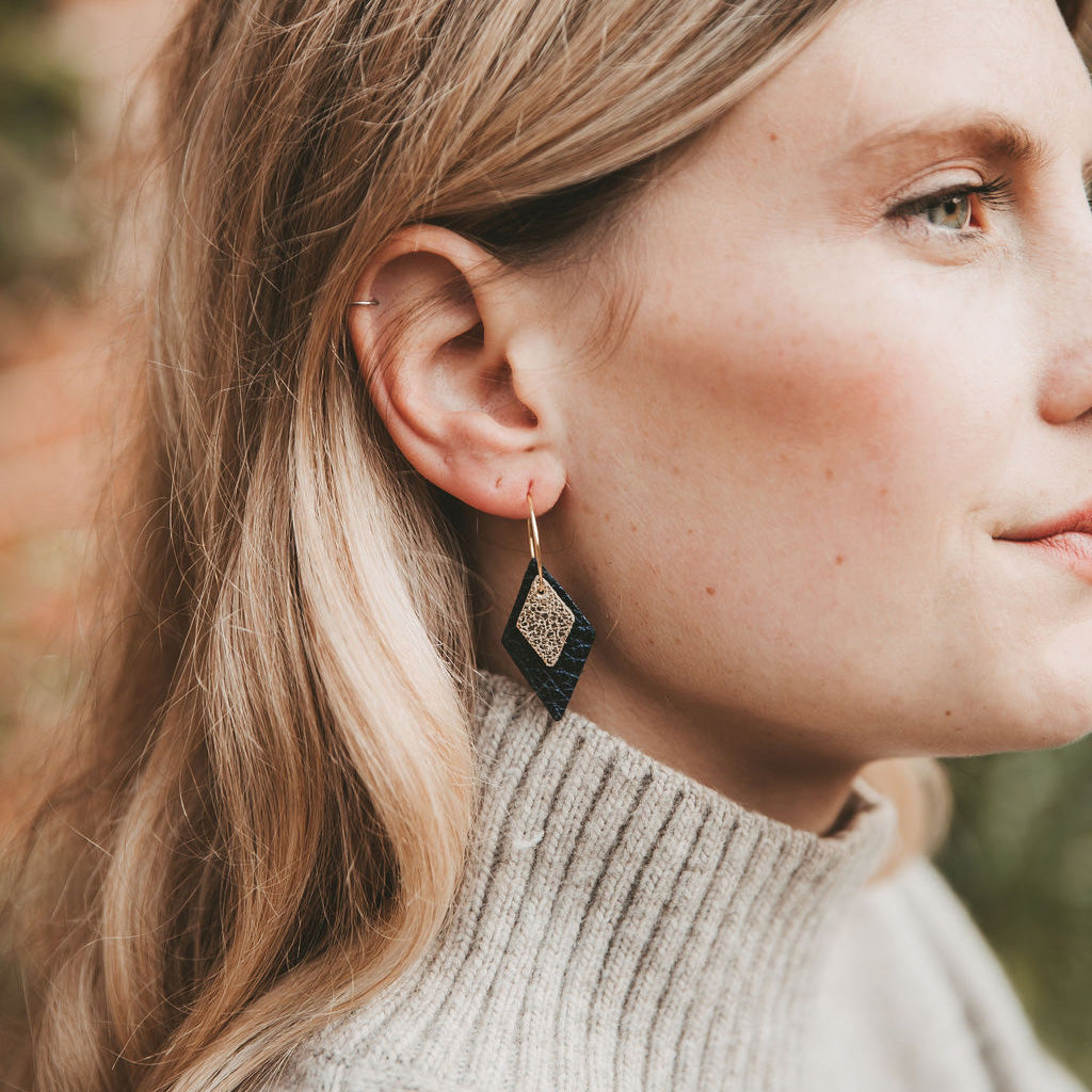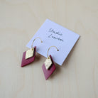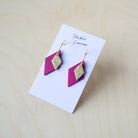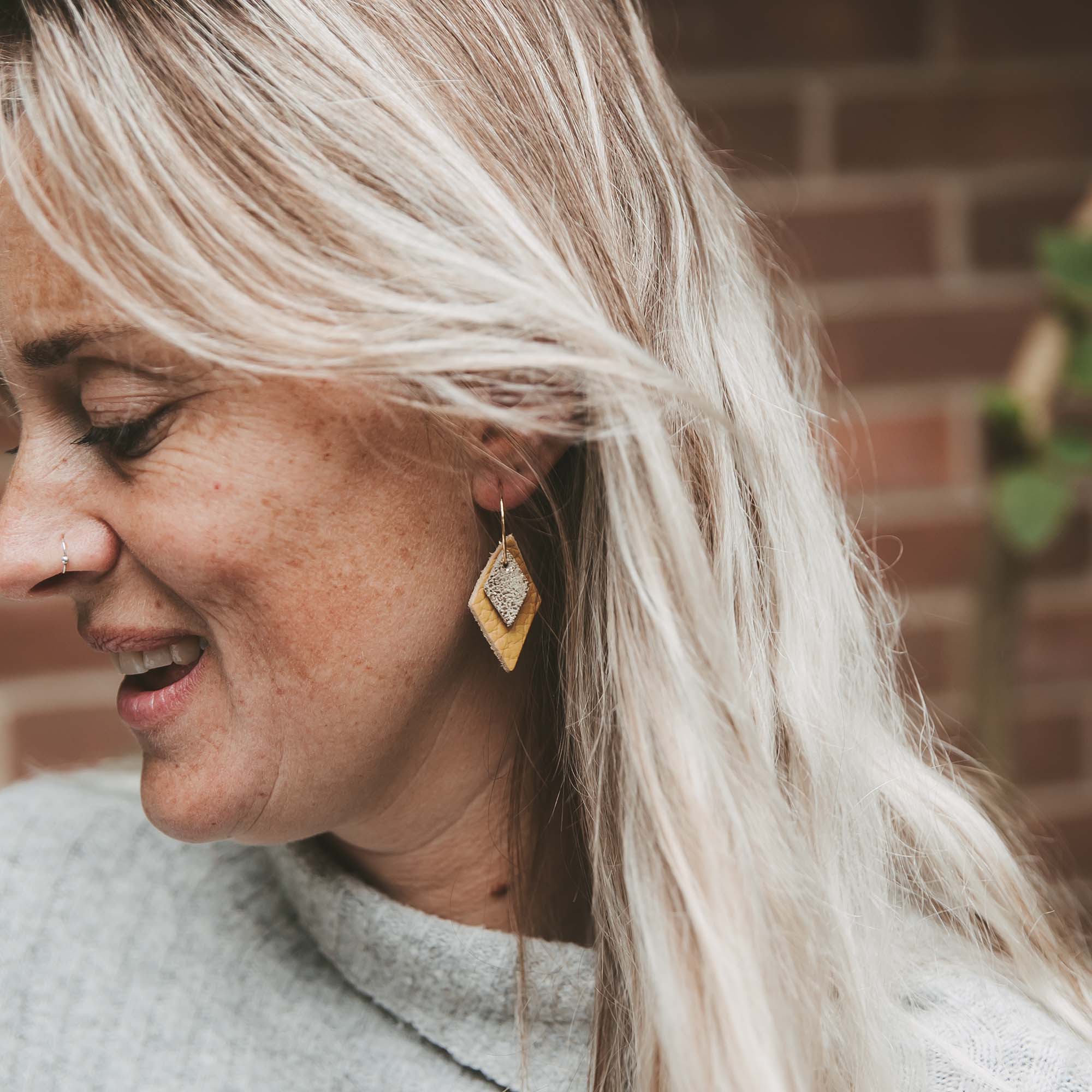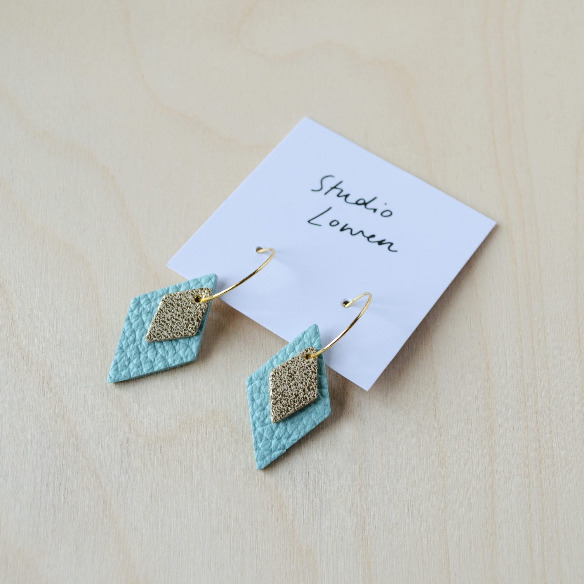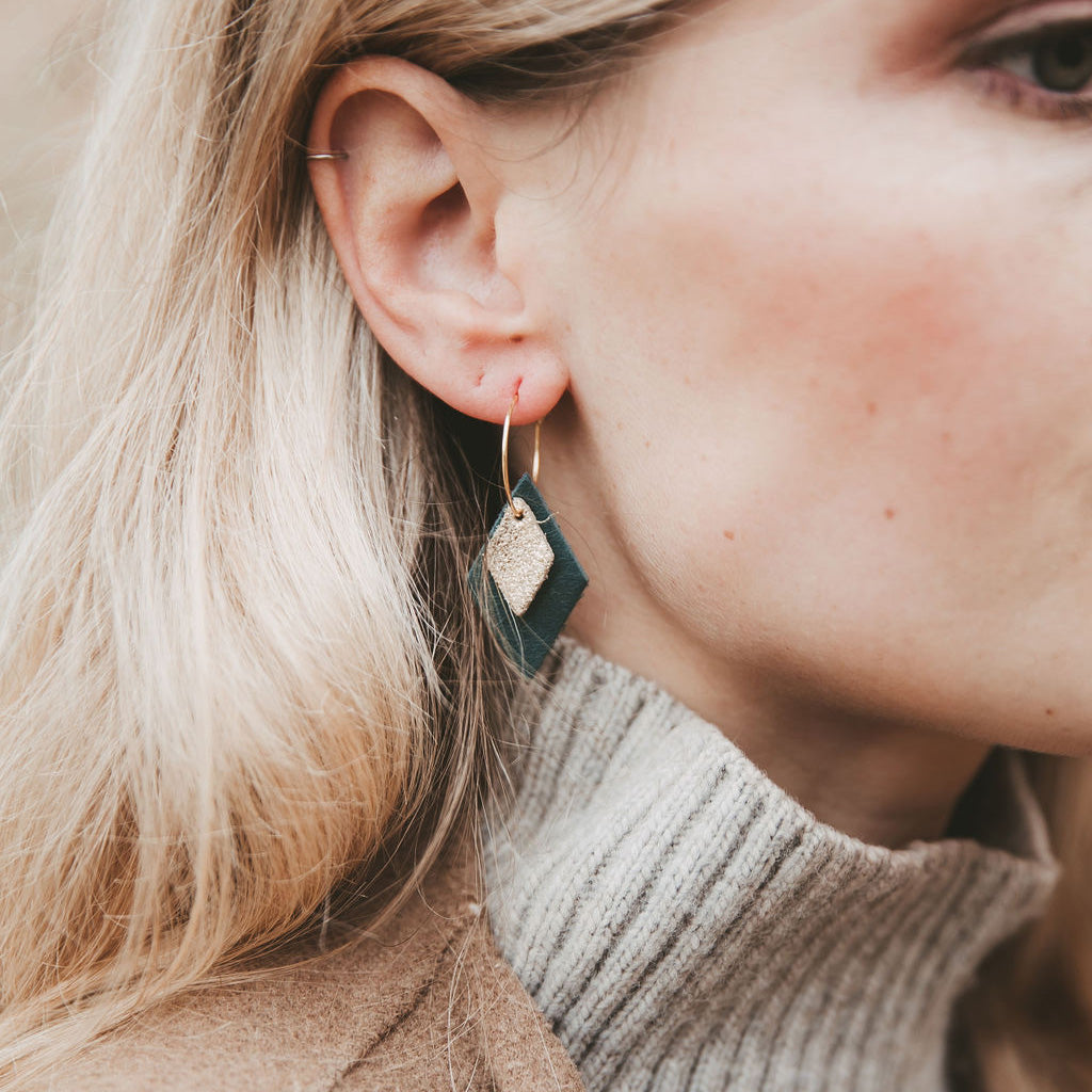 Made from offcuts of our beautiful suedes and leathers, these have colourful larger diamond shape and a smaller "Shimmer Gold" diamond that sits in front. The shapes dangle prettily from 18K gold plated hoops.