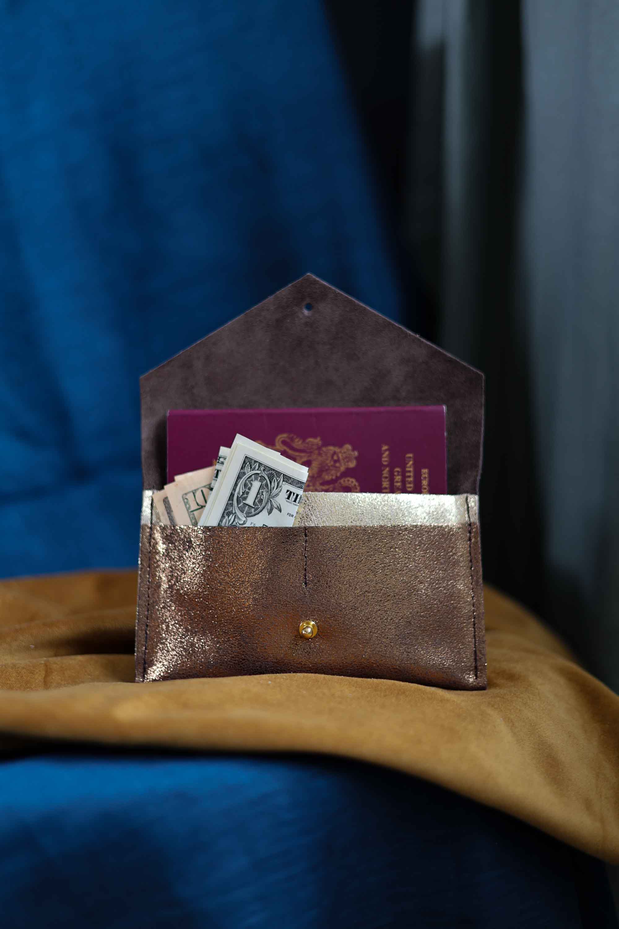 A beautiful and simple travel wallet with room for a couple of passports and some credit cards or travel cards. This beautiful, minimalist passport case can also be used as your everyday purse and use the card slots for credit cards. Each pouch comes with a gold internal pocket. Choose between gold or silver hardware and optional personalisation.