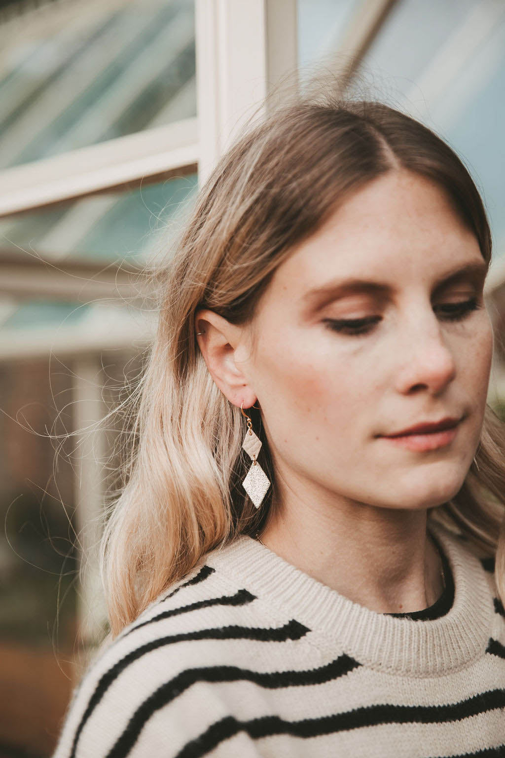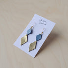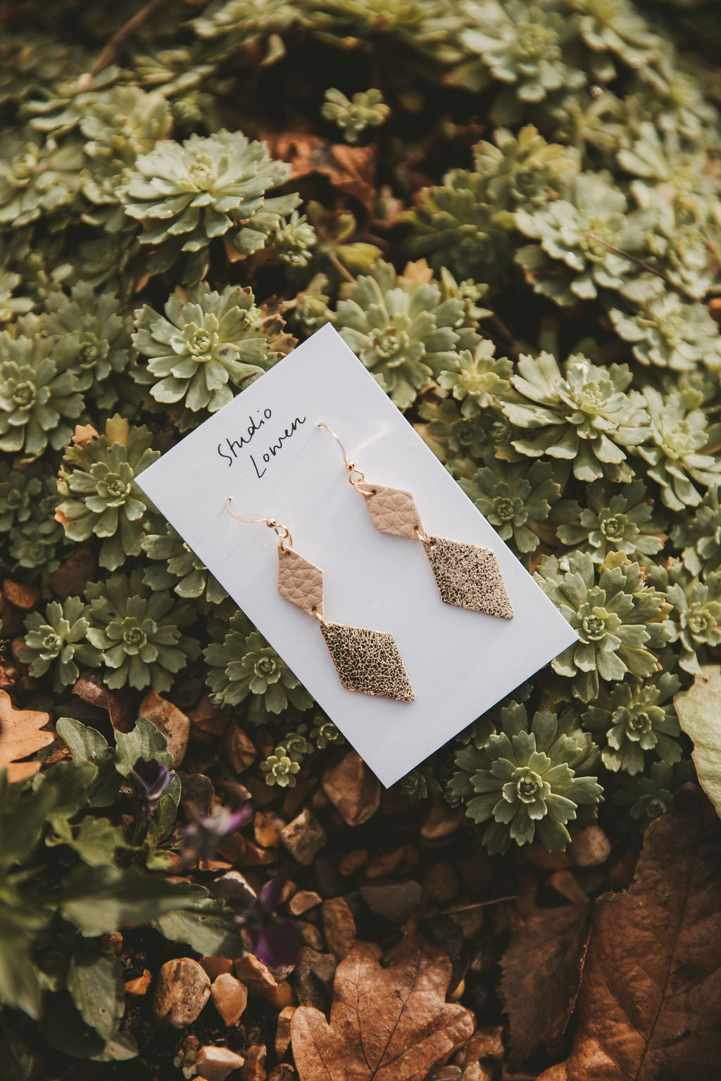 Made from offcuts of our beautiful suedes and leathers, these have a "Shimmer Gold" leather diamond shape at the bottom and then a choice of colours for the smaller bottom diamond at the top, pick below for the colour of the top diamond.