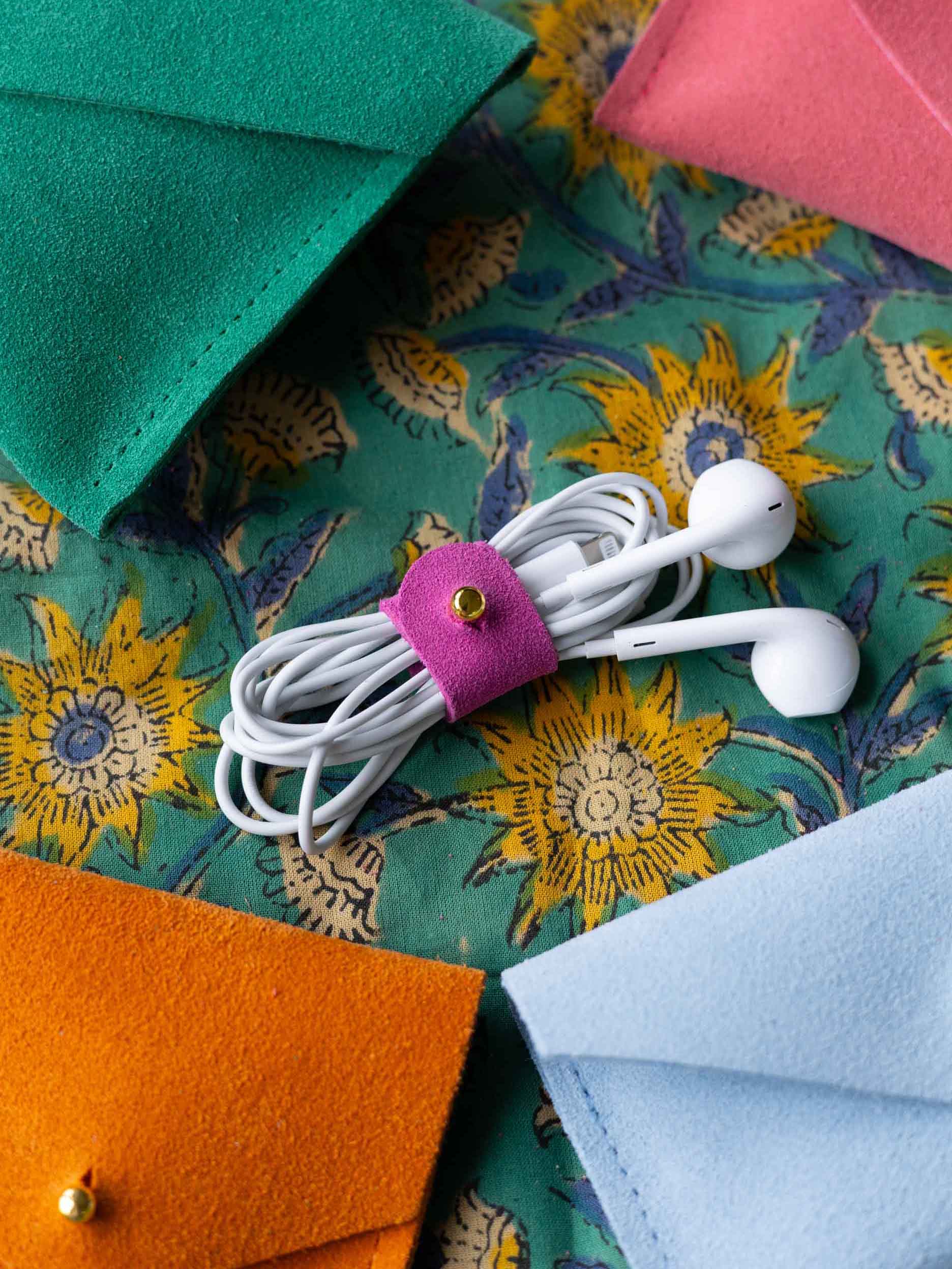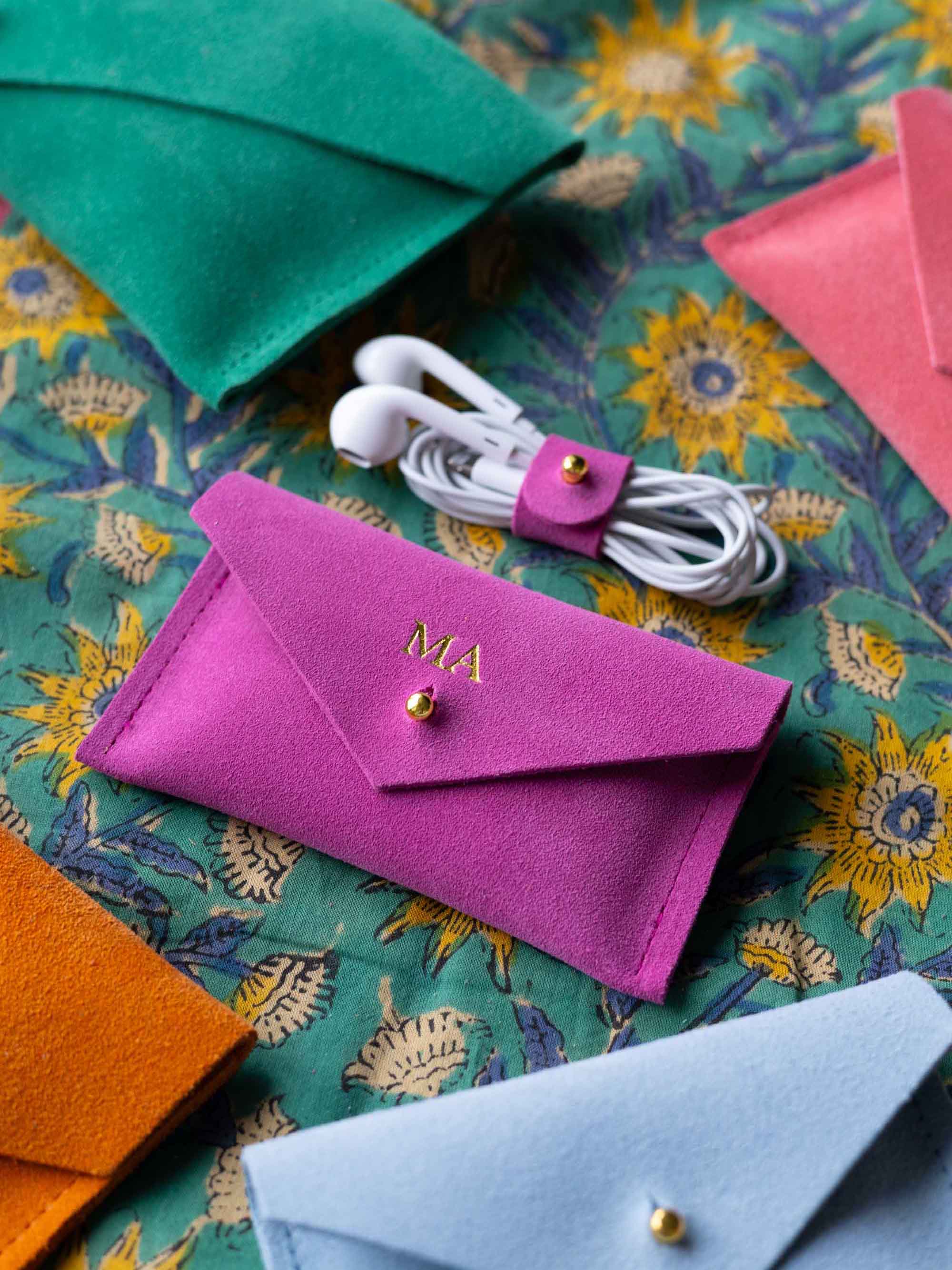 Keep your earphones tidy and easy to find in your bag with our colourful suede cable tidy and pouch set. Perfect for wired in-ear headphones, choose a bright colour and add personalisation to make them easy to find in your bag!