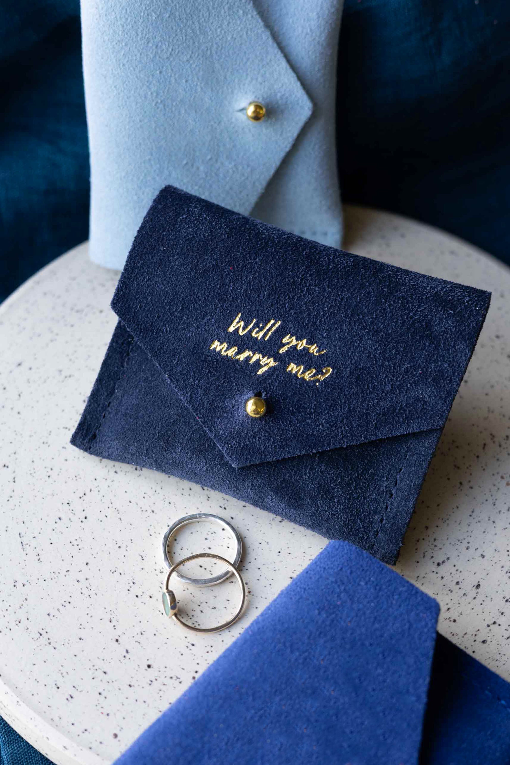 This jewellery pouch may carry smaller engagement ring boxes or alternatively the slim design of the proposal ring pouch will discreetly fit in your pocket.