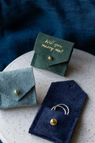 Pop the question with our smallest engagement ring pouch. Made with beautiful soft suede this little pouch features "Will you marry me?" in a choice of gold or silver on the front. Available in lots of colours - pick the one your fiancé to be will love the most!