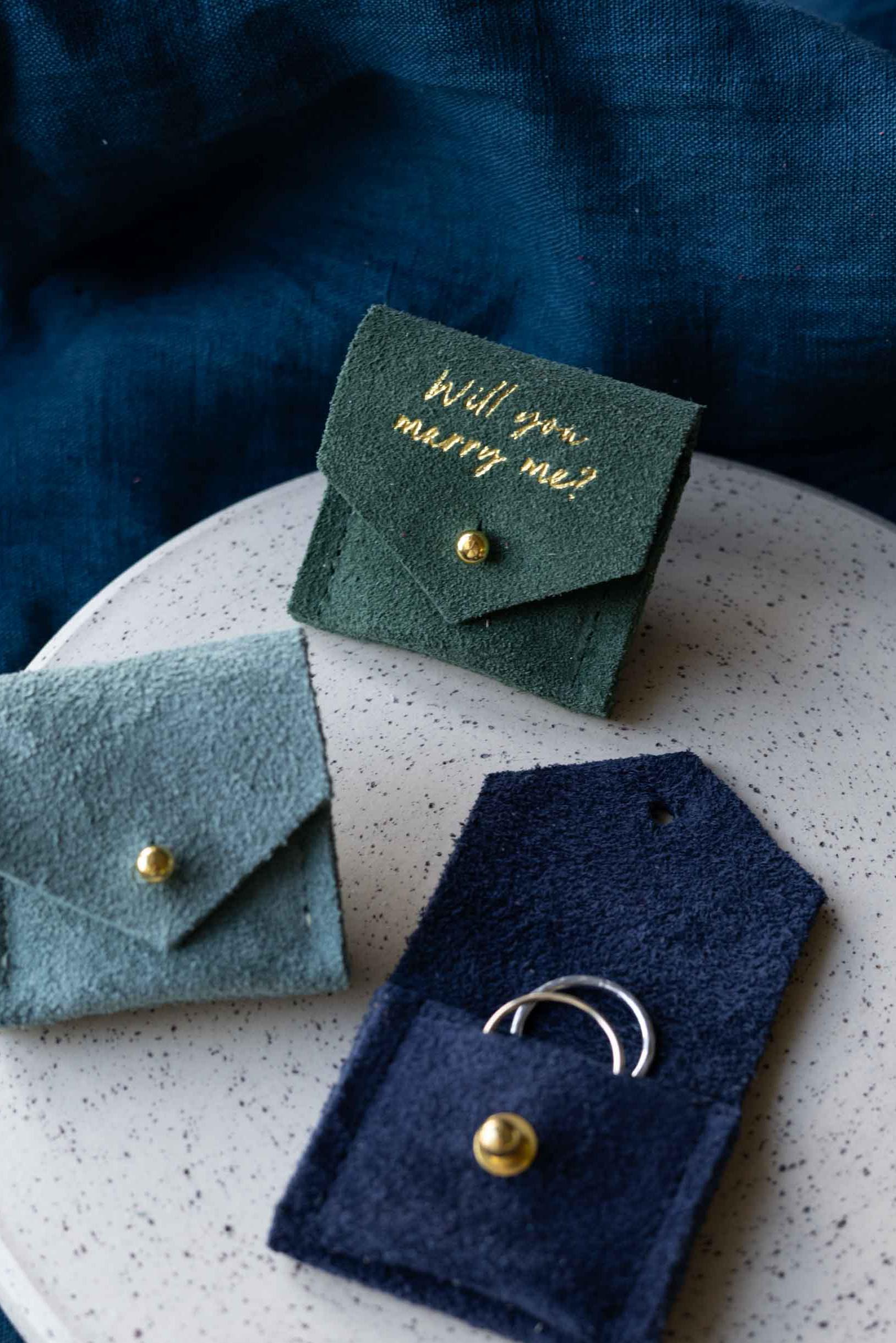Each suede wedding ring pouch is carefully crafted using gorgeous soft suede. Each one is finished with a minimalist stud in a choice of silver or gold.